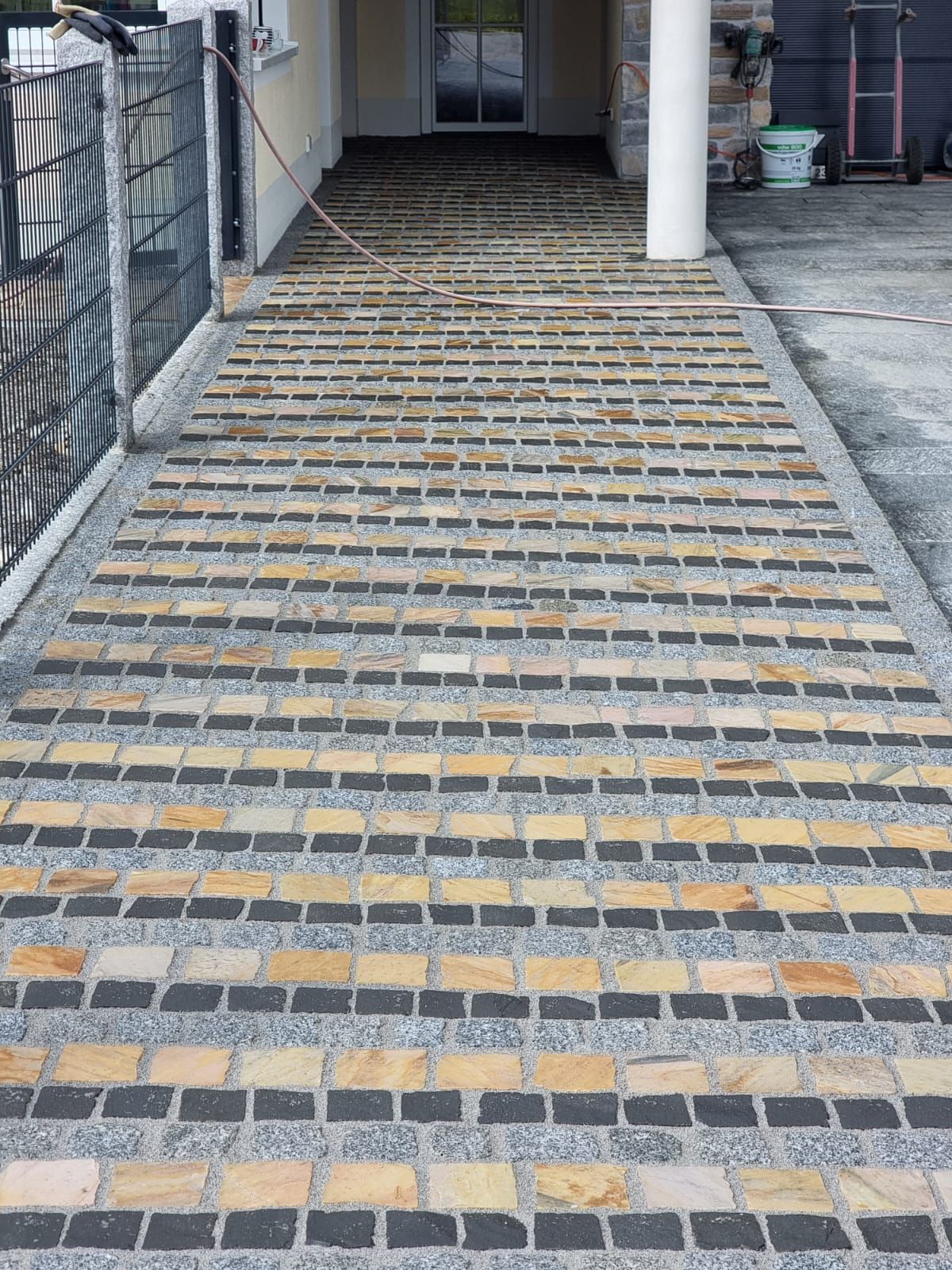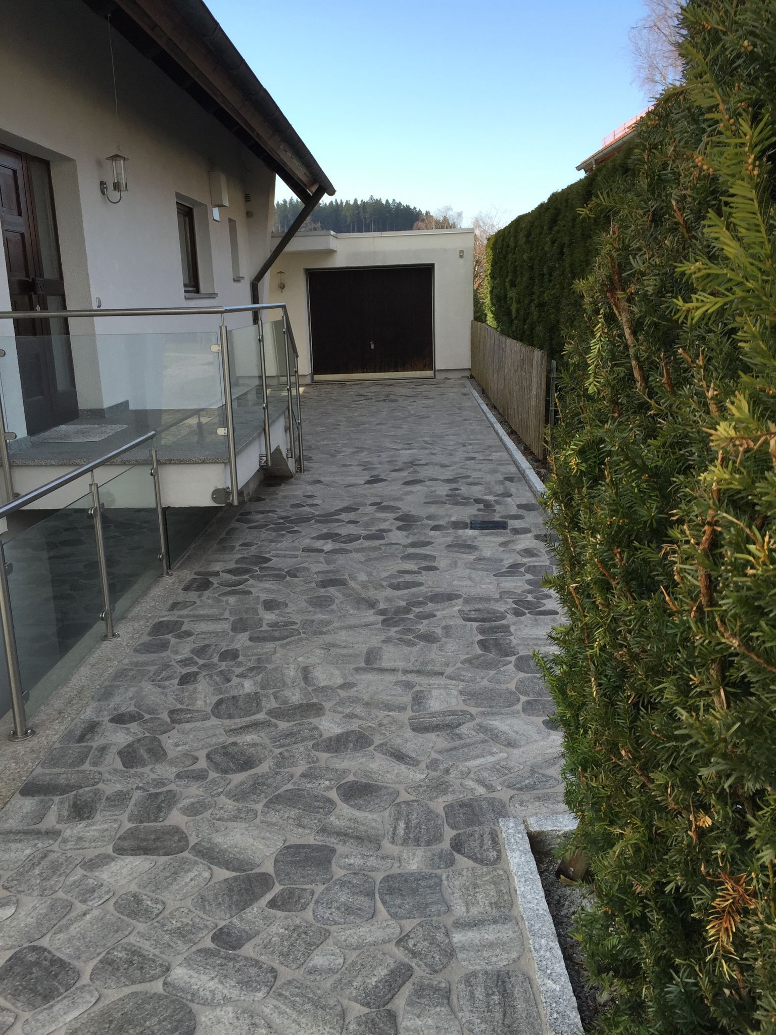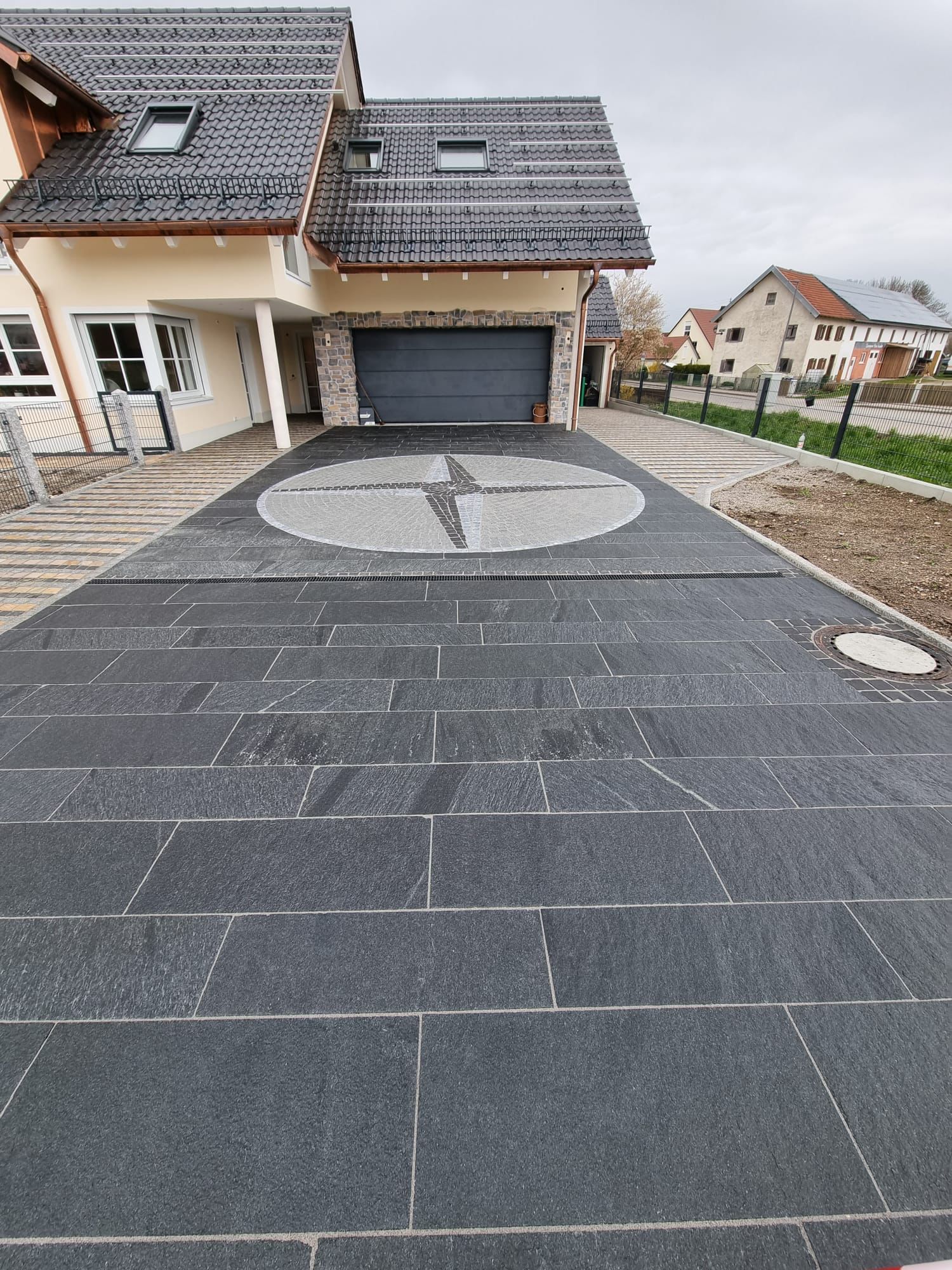 Bei uns finden Sie eine große Auswahl an Einfahrtslösungen, die aus widerstandsfähigen, pflegeleichten und langlebigen Materialien wie Beton- und Natursteinpflaster bestehen.